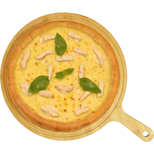 Pizza topped with alfredo sauce, grilled chicken, and mozzarella.